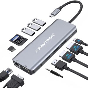 Ravtron 12 In 1 Type C Hub (3 Ports USB 3.0, USB 2.0, 2 x HDMI 4K@30 hz , Type C PD 100 watt, 3.5MM Audio, VGA, RJ45 GIGA, Card Reader )- Grey